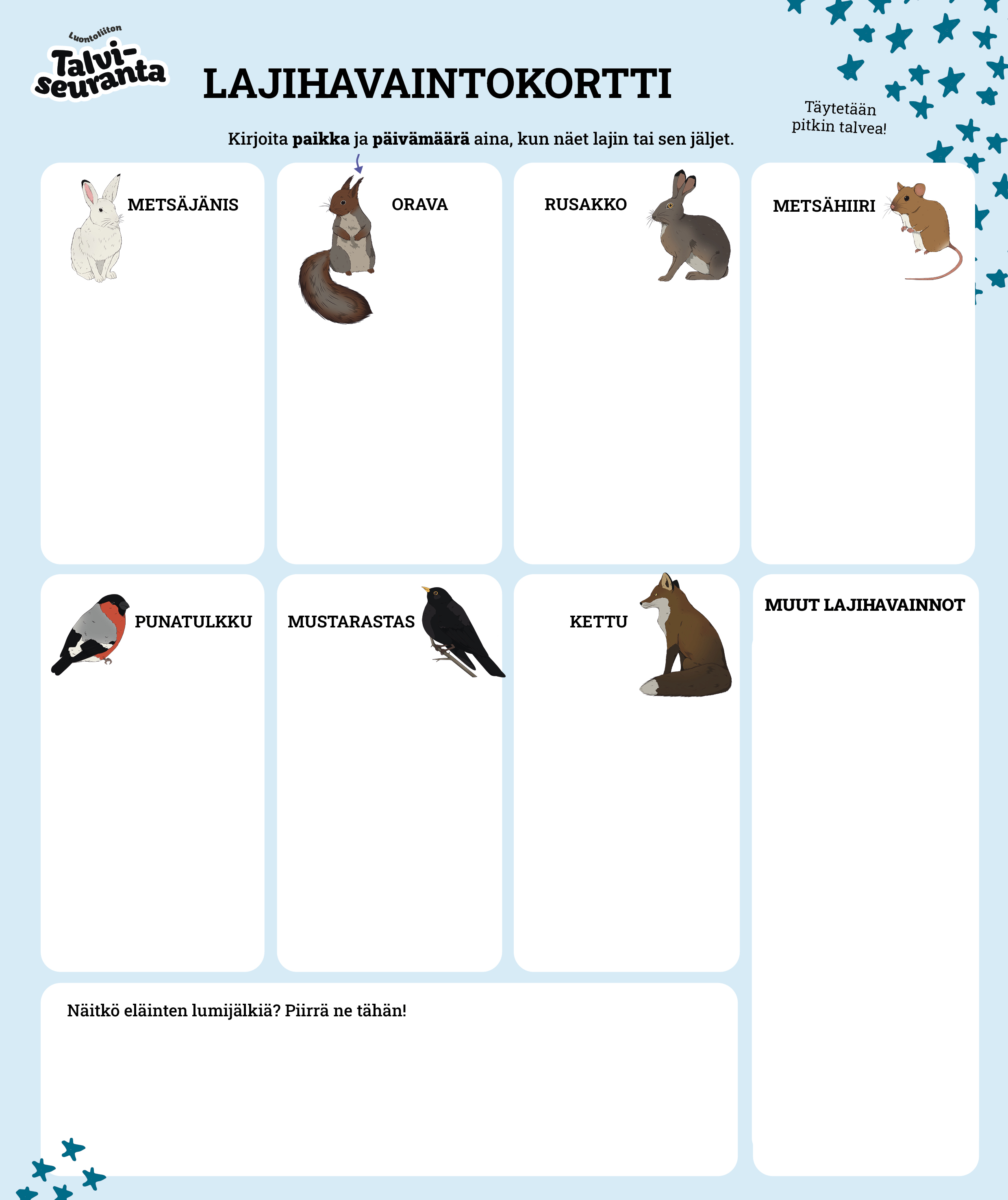 Lajihavaintokorttia täytetään pitkin talvea. Tarkkaile ja tunnista lumeen painautuneita jälkiä. Merkitse ylös näkemäsi lajit. Kaikkia lajeja ja niiden jälkiä ei tarvitse löytää – yksikin havainto on tärkeä!