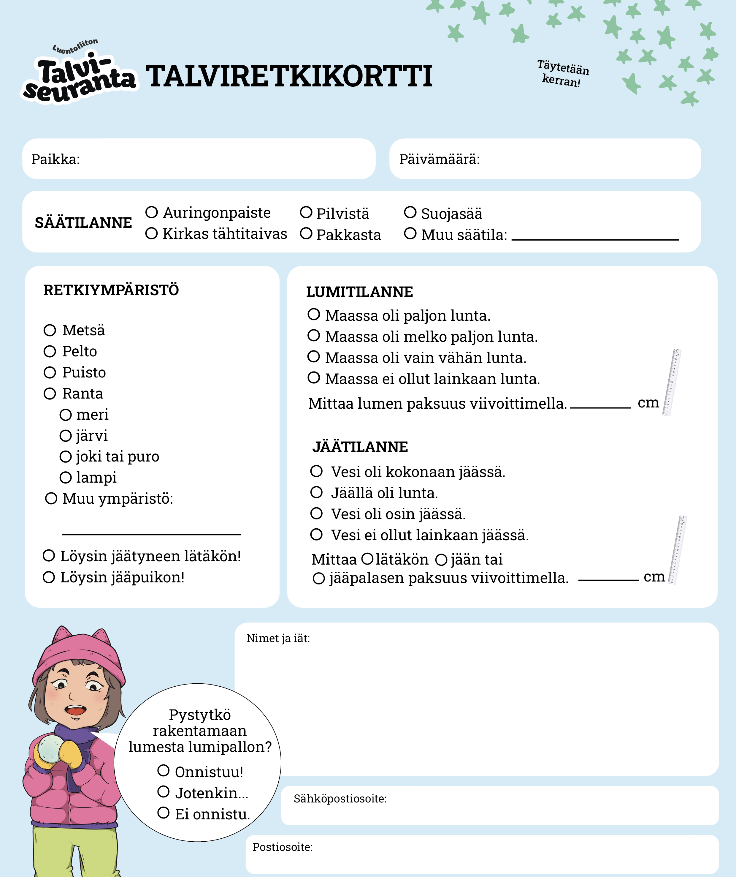 Talviseurannan tulostetut havaintokortit voi lähettää Luontoliiton sadunhohtoisen lastenlehti Siepon toimitukseen 14.4.2026 mennessä. Katso lisätiedot lasten Talviseurannasta. Kaikkien havaintokortin lähettäneiden kesken arvotaan pieniä palkintoja!